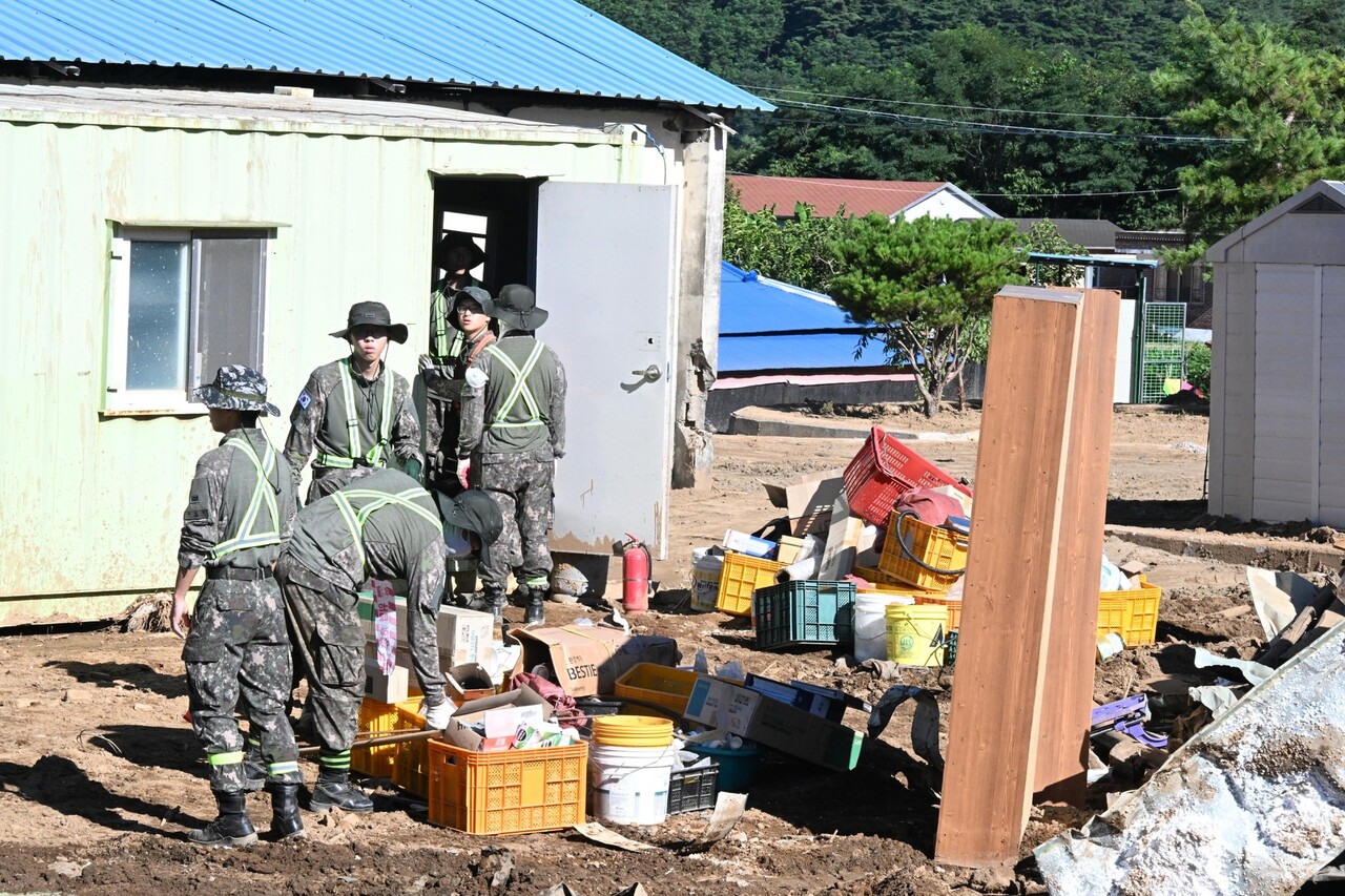 28일 산청군 산청읍 정곡리 홍수 피해현장에서 군인들이 청소작업하고 있다.
