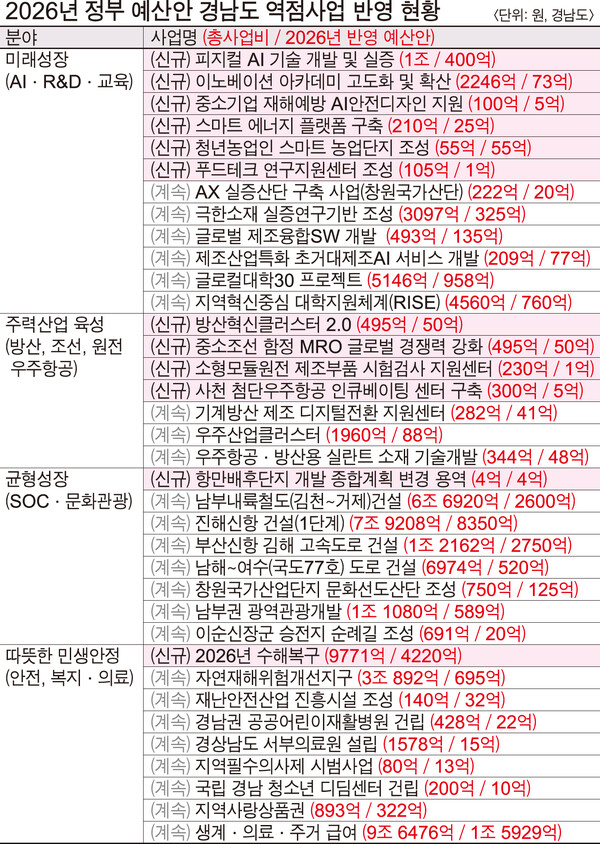 올해 추가경정예산으로 시작해 내년 본격화하는 수해 복구사업에는 4220억 원(총사업비 9771억 원)이 반영됐다. △경남권 공공어린이재활병원 건립사업 22억 원(총사업비 428억 원) △경상남도 서부의료원 설립 15억 원(총사업비 1578억 원) △지역필수의사제 시범사업 13억 원(총사업비 80억 원) △지역사랑상품권 322억 원(총사업비 893억 원) △청소년 마음건강 증진을 위한 국립 경남 청소년 디딤센터 건립 10억 원(총사업비 200억 원)도 포함됐다.