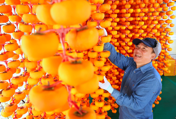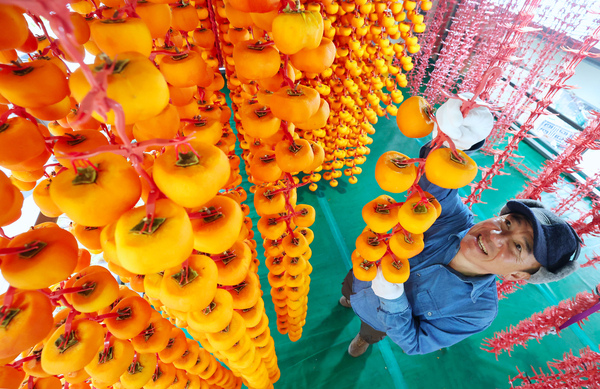 절기상 입동을 이틀 앞둔 5일 함양군 서하면 봉전리 오현마을 신서성(48) 씨가 곶감 건조대에 매달린 곶감을 정성스레 손질하고 있다. /함양군