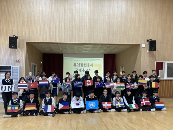 국립산청호국원(원장 김경나)이 11일 지리산고등학교 강당에서 ‘유엔참전용사 국제추모의 날’을 기념하는 행사를 열었다. 이날 행사에는 지리산고등학교 학생과 교직원 50여 명이 참여해 한국전쟁에 참여한 유엔 용사에게 감사의 메시지를 담은 퍼포먼스를 진행했다. /김태섭 기자