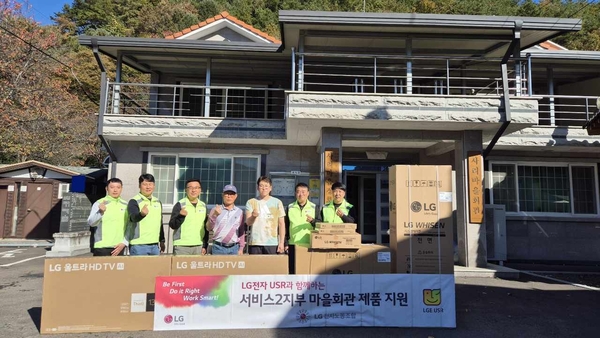 LG전자 노동조합(지부방 김대철)이 산청군 시천면 사리마을에 500만 원 상당 전자제품(TV·냉온풍기)을 기부했다. 이번 기부는 마을회관에서 사용하는 전자제품 중 10년 이상 노후되고 고장난 제품을 새 것으로 교체하는 사회적 책임(USR) 활동으로 추진됐다. /김태섭 기자