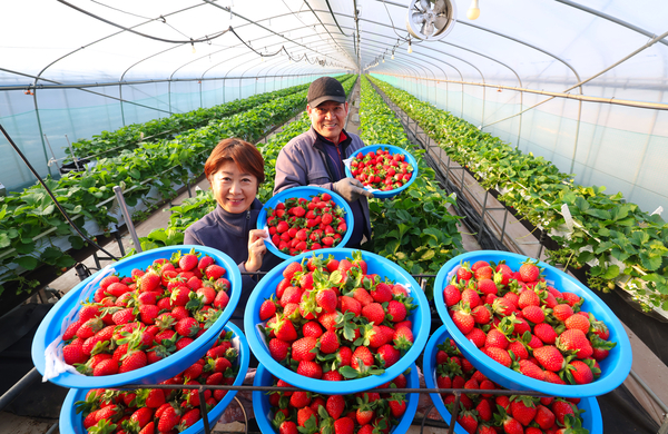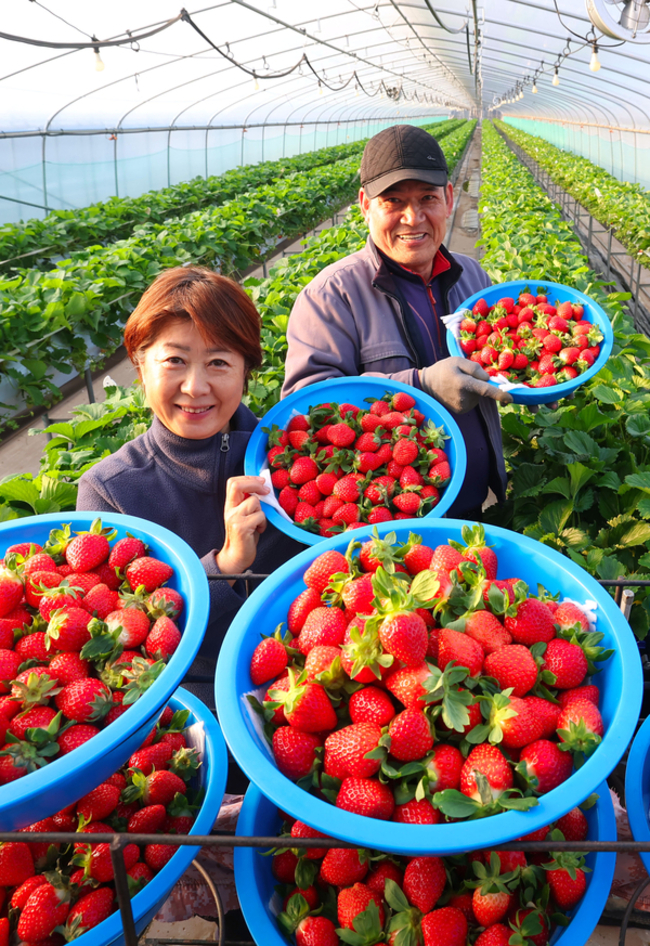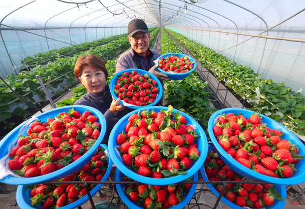 쌀쌀한 겨울 날씨를 보인 18일 함양군 지곡면 창촌마을 이감성 씨 부부가 딸기 하우스에서 새콤달콤한 ‘설향’ 딸기를 들어 보이고 있다. /함양군