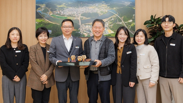 합천군 대병면에 사는 고영배 씨가 24일 합천군청을 방문해 공예품 ‘별쿵이와 걷는 합천길’을 기증했다. 합천군 대표 캐릭터 별쿵이를 중심으로 시골의 따뜻한 정서와 자연 속 일상을 감성적으로 표현한 인테리어 공예품으로서 ‘제10회 합천공예품 경진대회’에서 대상을 받았다. /유은상 기자