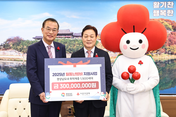 박완수 경남도지사가 24일 경남사회복지공동모금회와 함께 연말연시 나눔 분위기 확산을 위해 ‘희망2026 나눔캠페인’ 시작을 알리고, 주요 기관장이 참여하는 ‘사랑의 열매 달기’ 릴레이를 시작했다. 이날 모금회는 도내 취약계층 겨울나기 난방비 3억 원을 경남도에 전달했다. /이동욱 기자